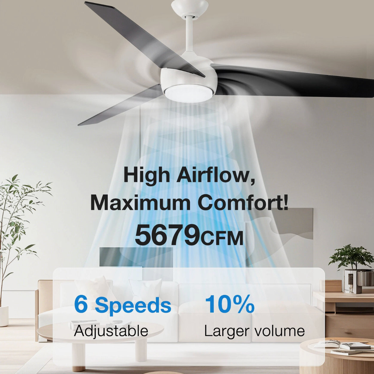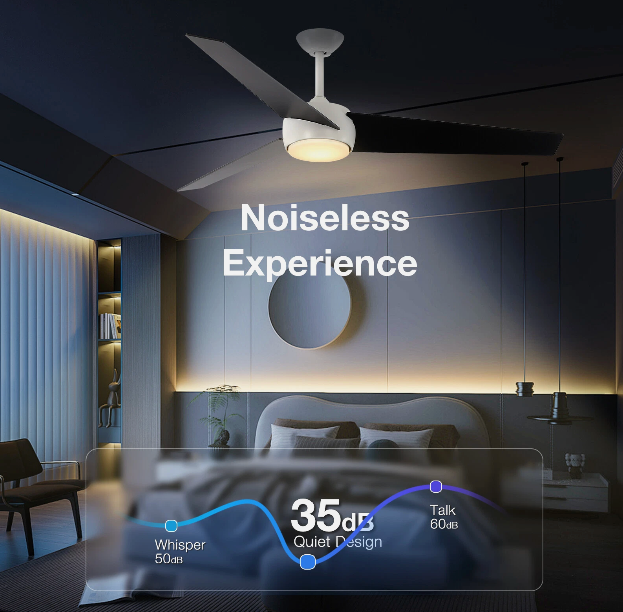 This is a 60-inch 3-blade ceiling fan.First of all, the fan blades are made of solid wood, which will provide you with a refreshing and comfortable feeling.Secondly, the ceiling fan is illuminated by 24W LED lights; there are warm, natural and cool lights for you to choose from. Moreover, both the ceiling fan and the light can be controlled independently to meet the needs of different scenarios as much as possible.It is worth mentioning that the ceiling fan uses a DC motor, which saves electricity compared to ordinary motors. There are 6 wind speeds to choose from, and the sound volume is less than 35 decibels when the motor is working in an energy-saving way. The motor also offers a reverse function, which can bring you a refreshing breeze in summer and speed up the efficiency of circulating warm and fresh air in the room in winter, maximizing your experience. In addition, more detailed product parameters are available on the property page.