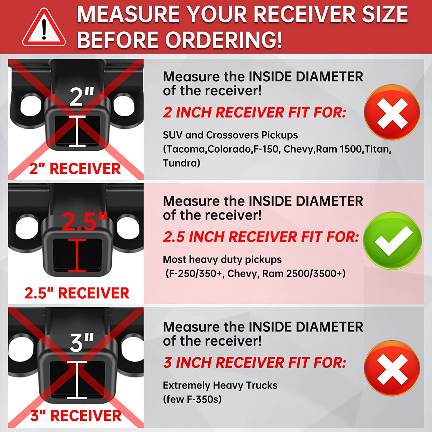 - Good for Purpose Towing: Fit for 2.5" trailer hitch receivers, the 2" ball will handle 8,000 pounds, while the 2-5/16" ball is rated for a great 18,500 pounds. (Especially suitable for F-250/350+, Chevy 2500/3500+, Ram 2500/3500+).