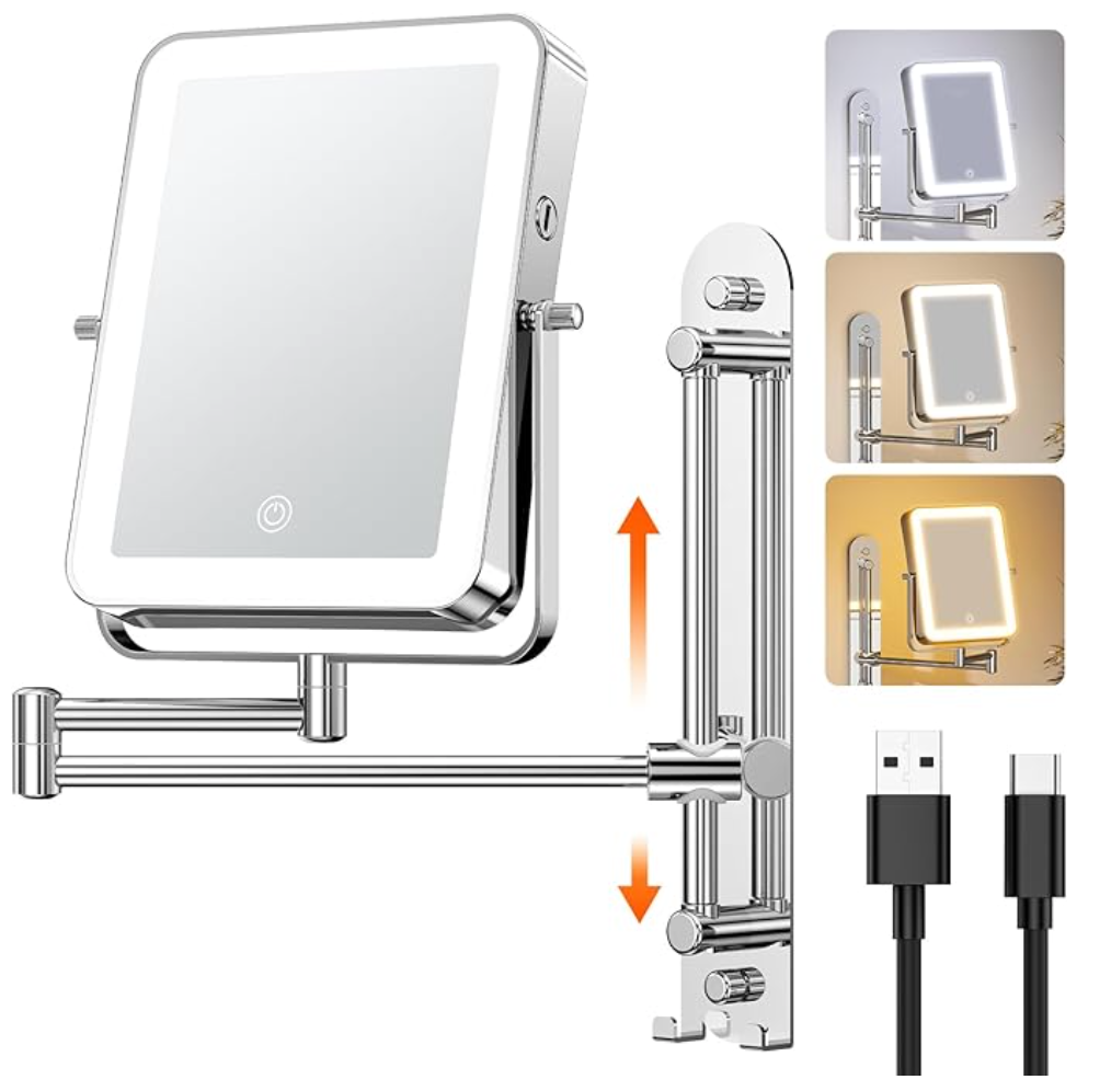 Height Adjustable Wall Mounted Lighted Makeup Mirror with Hooks, 3000mAh Rechargeable with 1X/10X Magnification, 3 Light Colors and Stepless Dimming for Bathroom