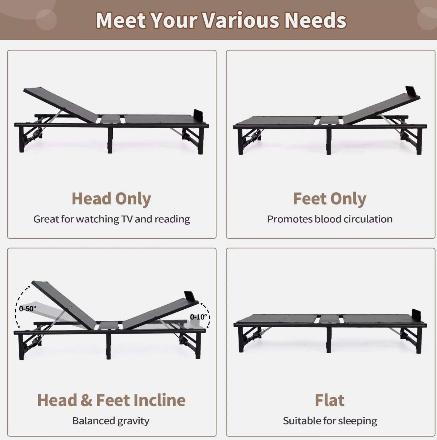 【Fit Your Different Bed Activities】: Raise the head from 0 to 50 degrees and the feet from 0 to 10 degrees. This lifting bed frame offers flexible positions for sleeping, exercising, working, watching TV, relaxing, and get-up assistance.