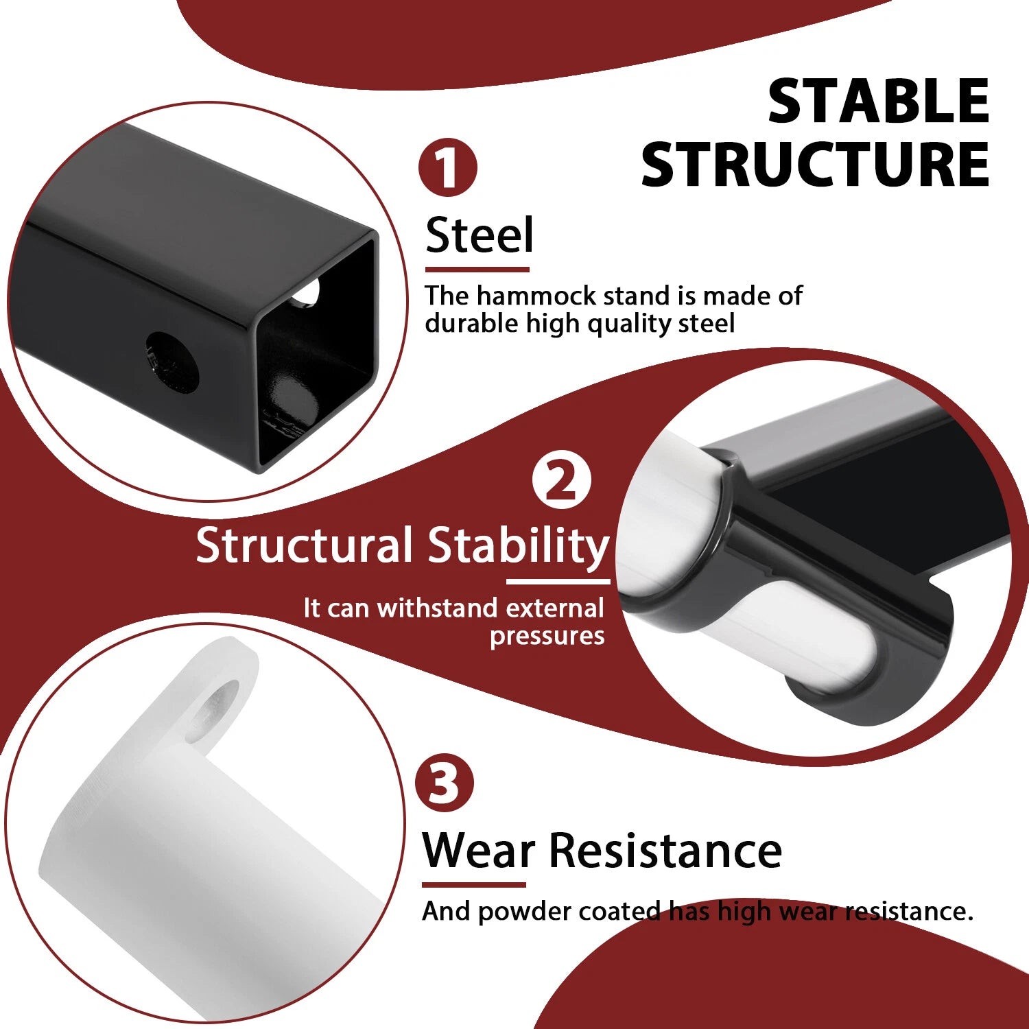 Heavy-duty construction:Steel with raw aluminum arms, this hitch mount hammock stand is built to withstand the elements and provide a sturdy support for your hammock.